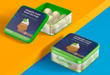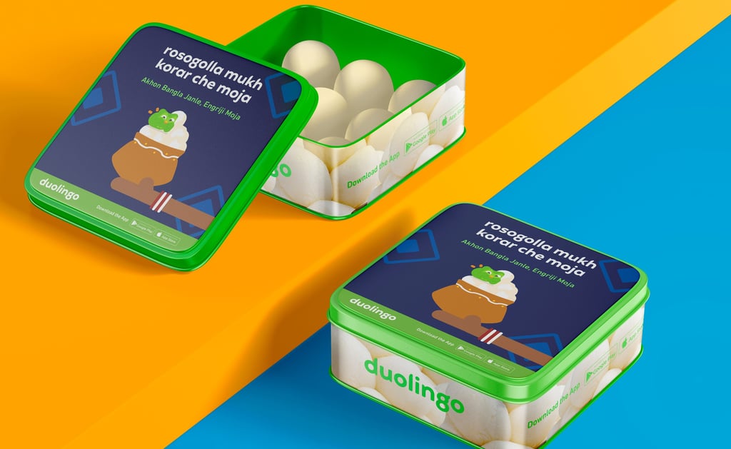 Did the packaging design by artfully integrating Bangla and Duolingo branding elements along with it's illustration style into the package design, complementing the cultural essence of Bengali sweets.