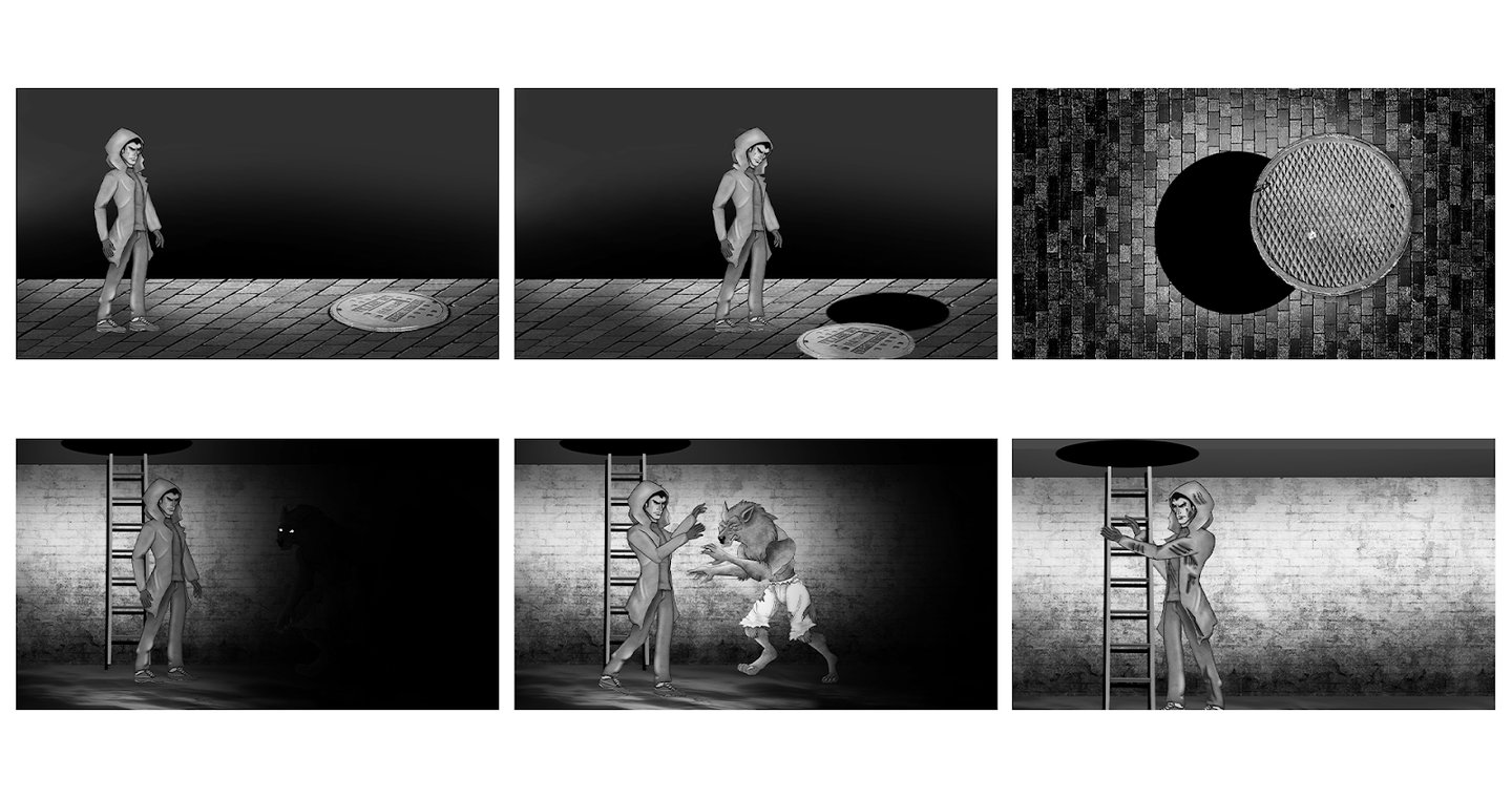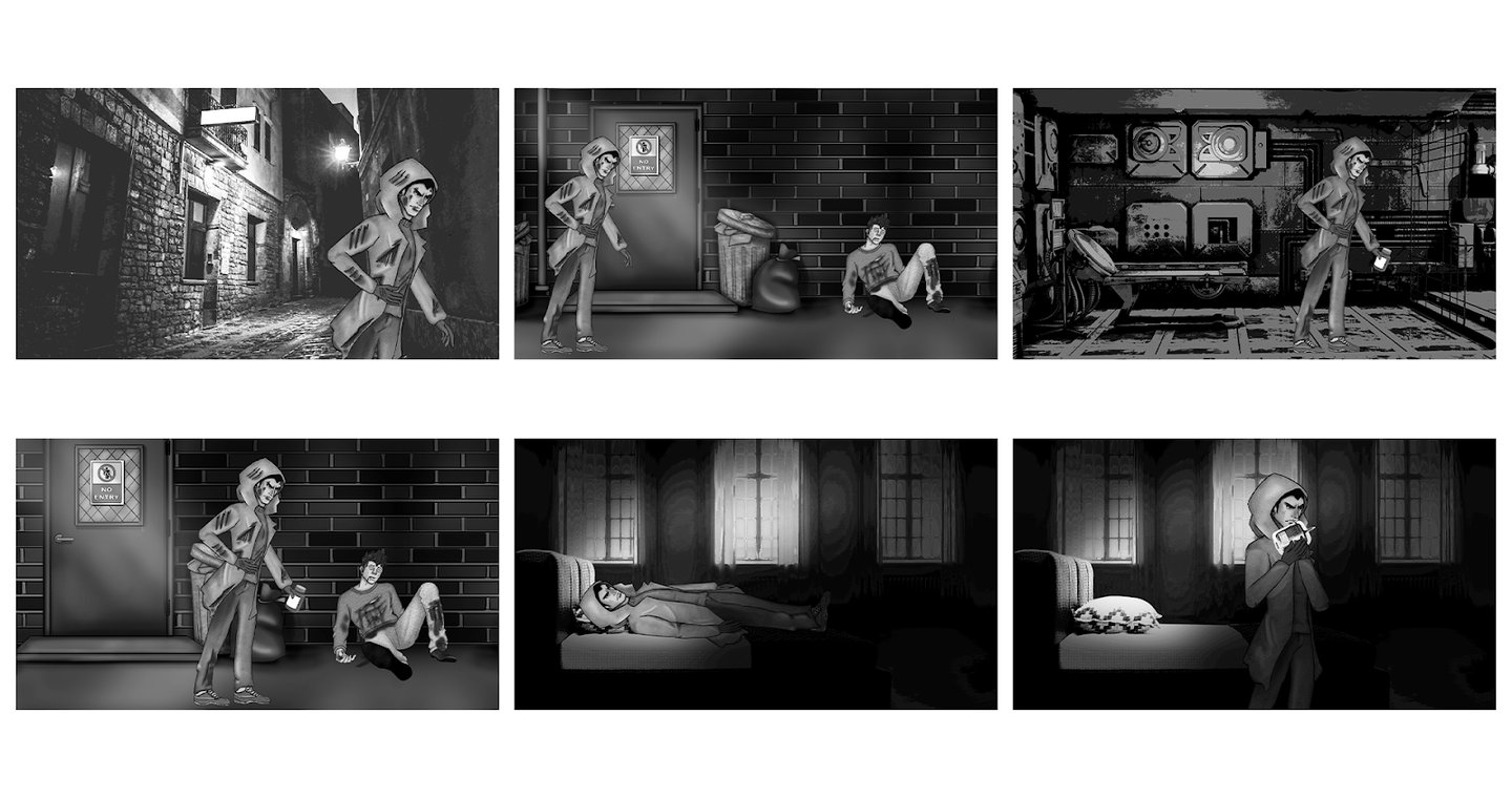 I kept in mind the simple 2-D style visuals used in the game Pentiment, which is used throughout the storyboard. I created the compositions using characters designed by my teammate Zoha, while I conceptualised the background, setting, lighting, camera angles, and so on in each frame. I made certain to capture the essence of both the mediaeval mood and the incorporation of modern aesthetics in it, which is set in the town of Kingston, United Kingdom.